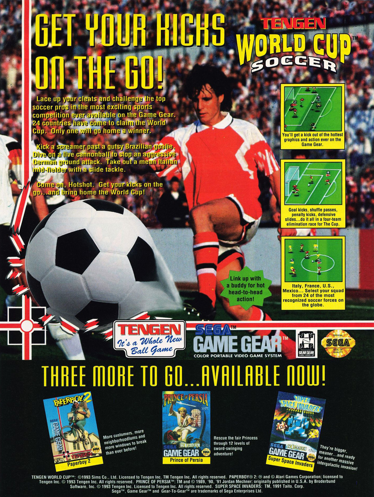 Sometimes that old saying about good things coming in small packages is true. Such is the case with Tengen's World Cup Soccer for the Game Gear. Surprisingly, this simple, fun-to-play cart has most of the features of its 16-bit counterparts.