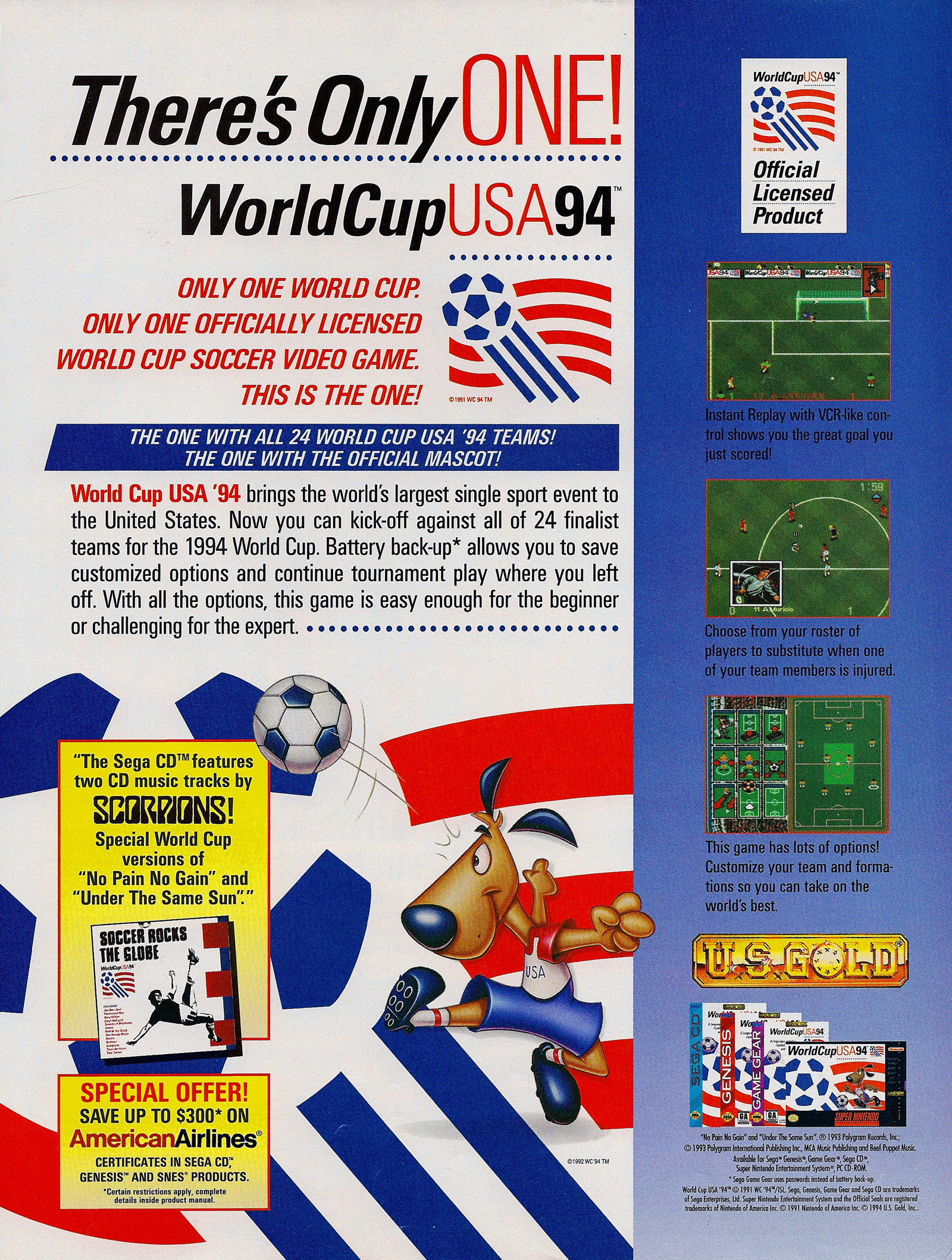 With the World Cup taking over U.S. stadiums this summer, it seems like every video game company is releasing its own version of this international event. U.S. Gold contributes the above- average World Cup USA '94 for the Super NES. This game has an amazing range of options, good controls, and great sound, but its graphics miss wide of the goal.