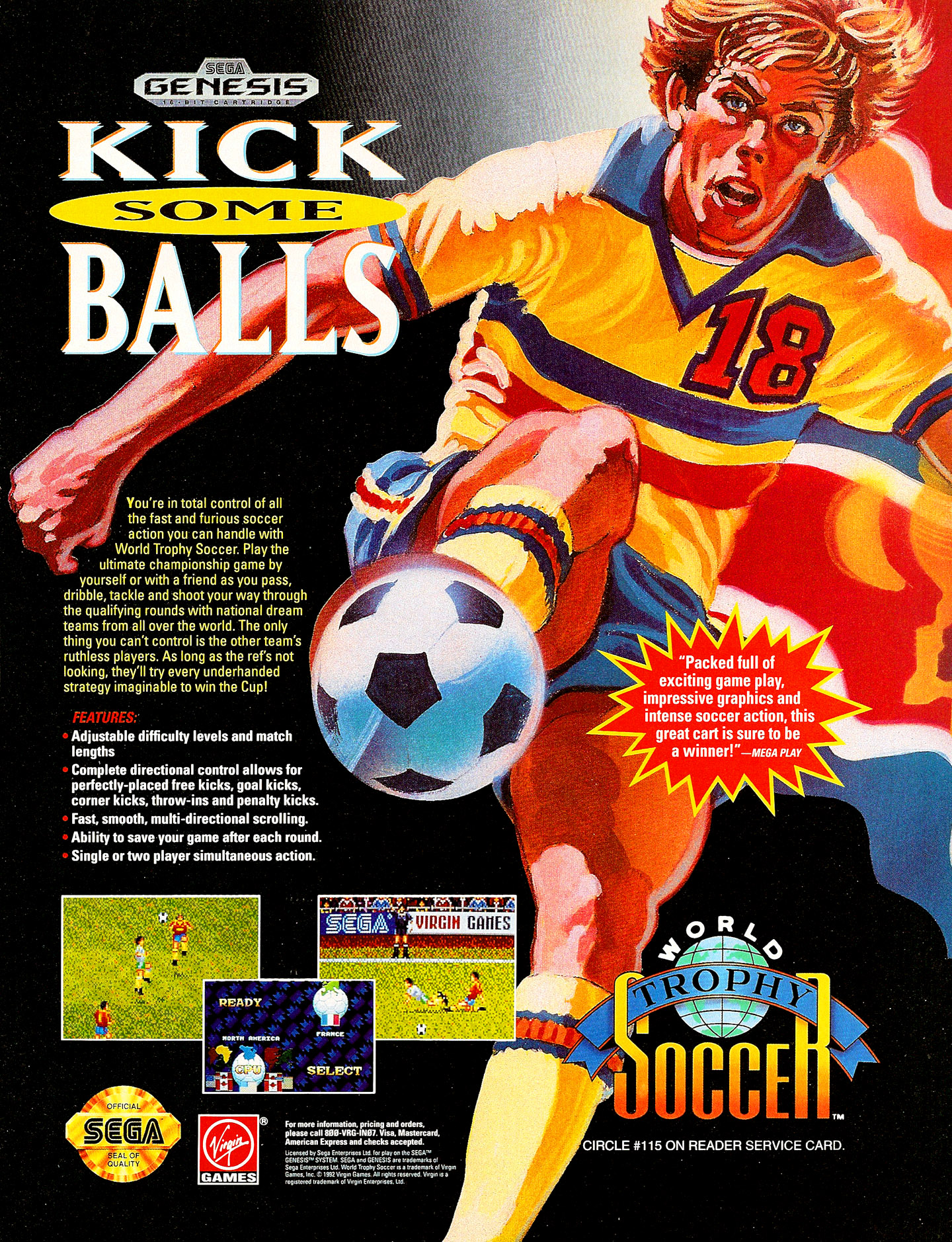 With the World Cup coming to America next year, it's time to put a Genesis soccer game on the market. It comes in the form of World Trophy Soccer by Virgin Games.
