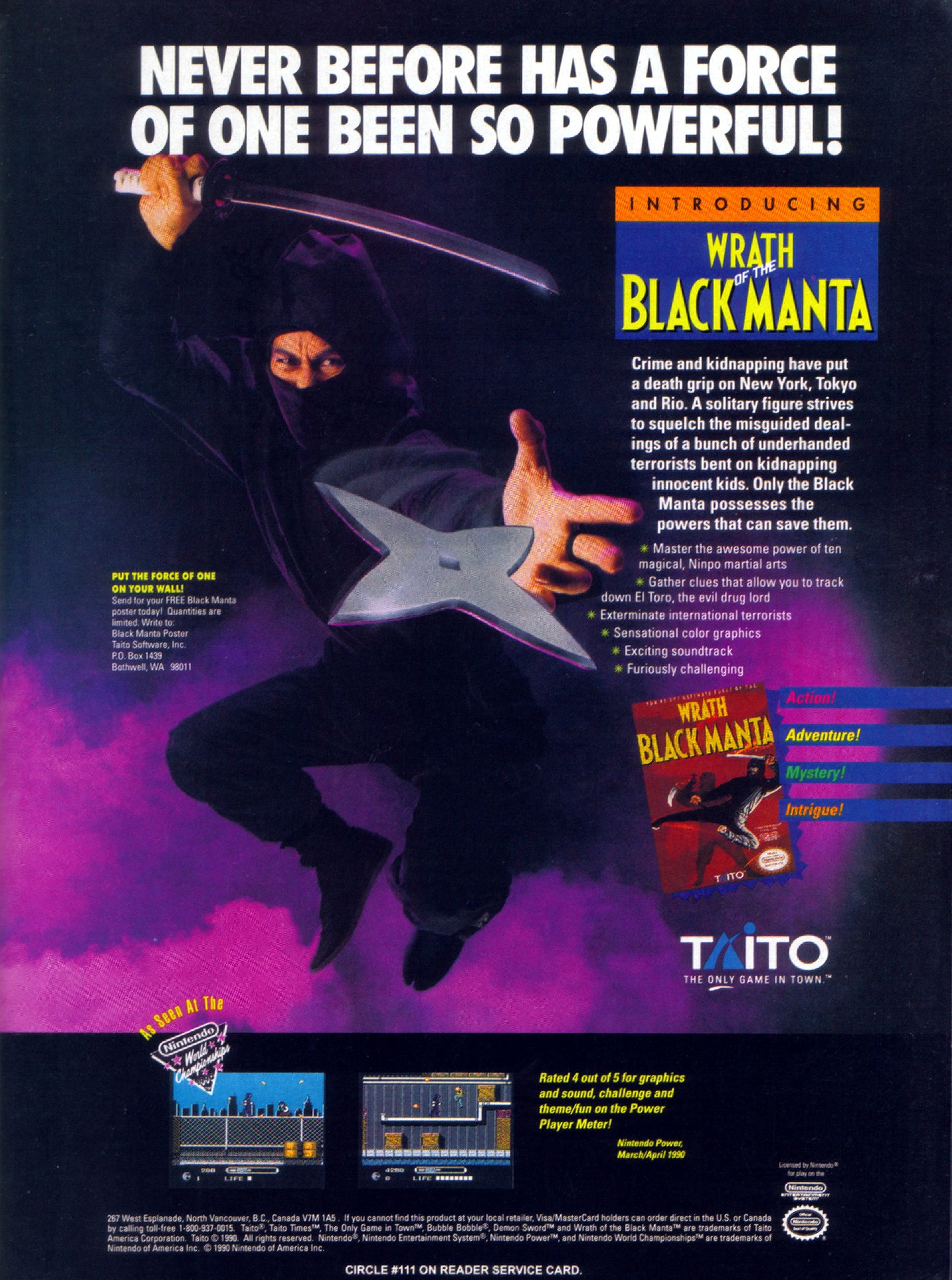 Wrath of the Black Manta, which is also known as Ninja Cop Saizou, was a game for the NES created by Taito in 1990. The main game character is a ninja called Black Manta, who has to save children from kidnappers.