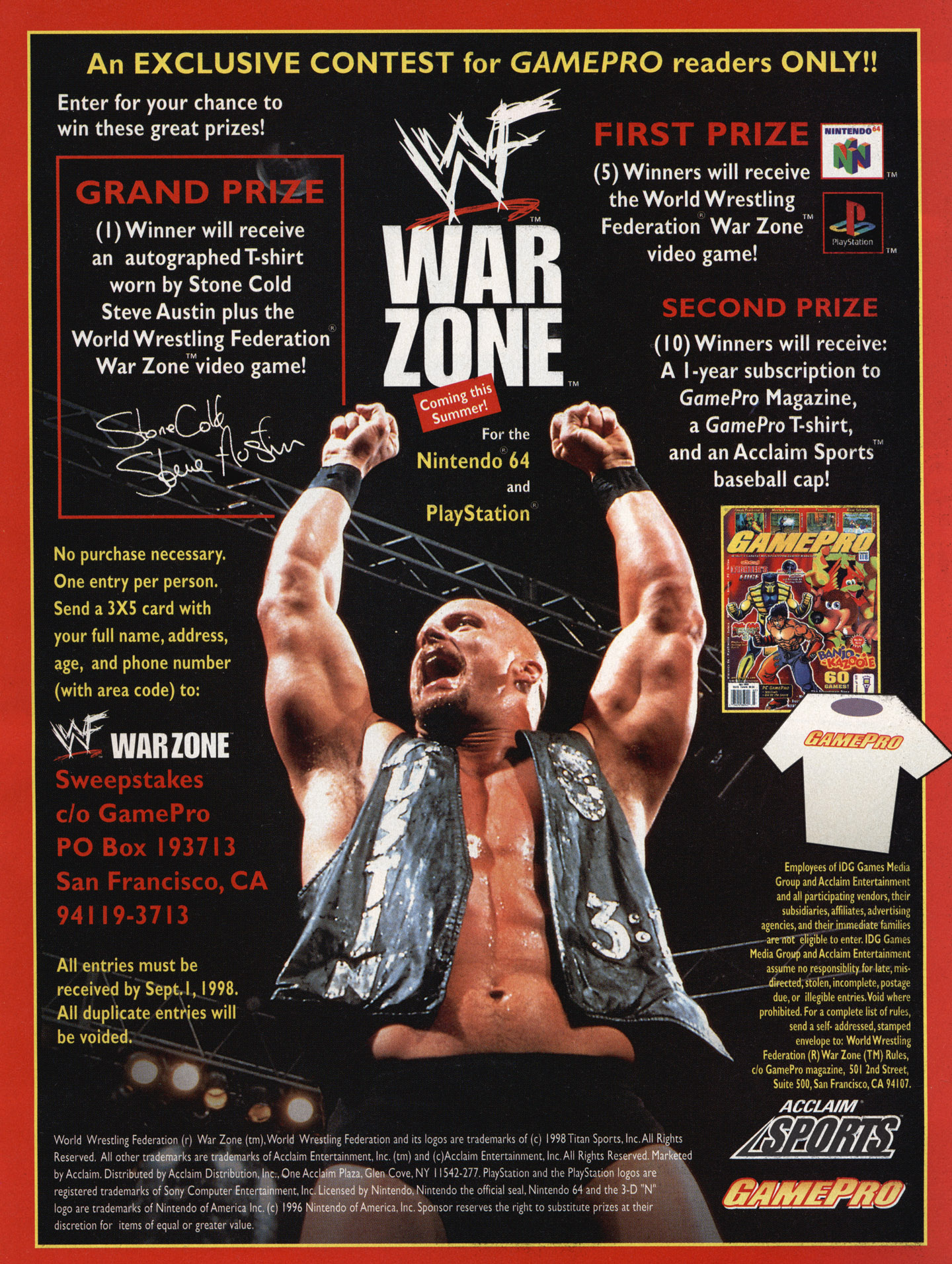 The game features over 15 wrestlers--from "Stone Cold" Steve Austin to the Undertaker-each possessing over 30 authentic wrestling moves, including submission holds, top rope (and even top cage!) aerial maneuvers, and special finishers such as the Tombstone Piledriver. War Zone also hits the mat with a variety of fun match types including Tag Team, Steel Cage, Weapons, War, Challenge, and Versus modes. (Unfortunately, the originally promised Ladder matches were eliminated from the final version of the game.) You can create your own wrestlers, learn moves through a training mode, and get into grudge matches against hated heels on your way to the title.