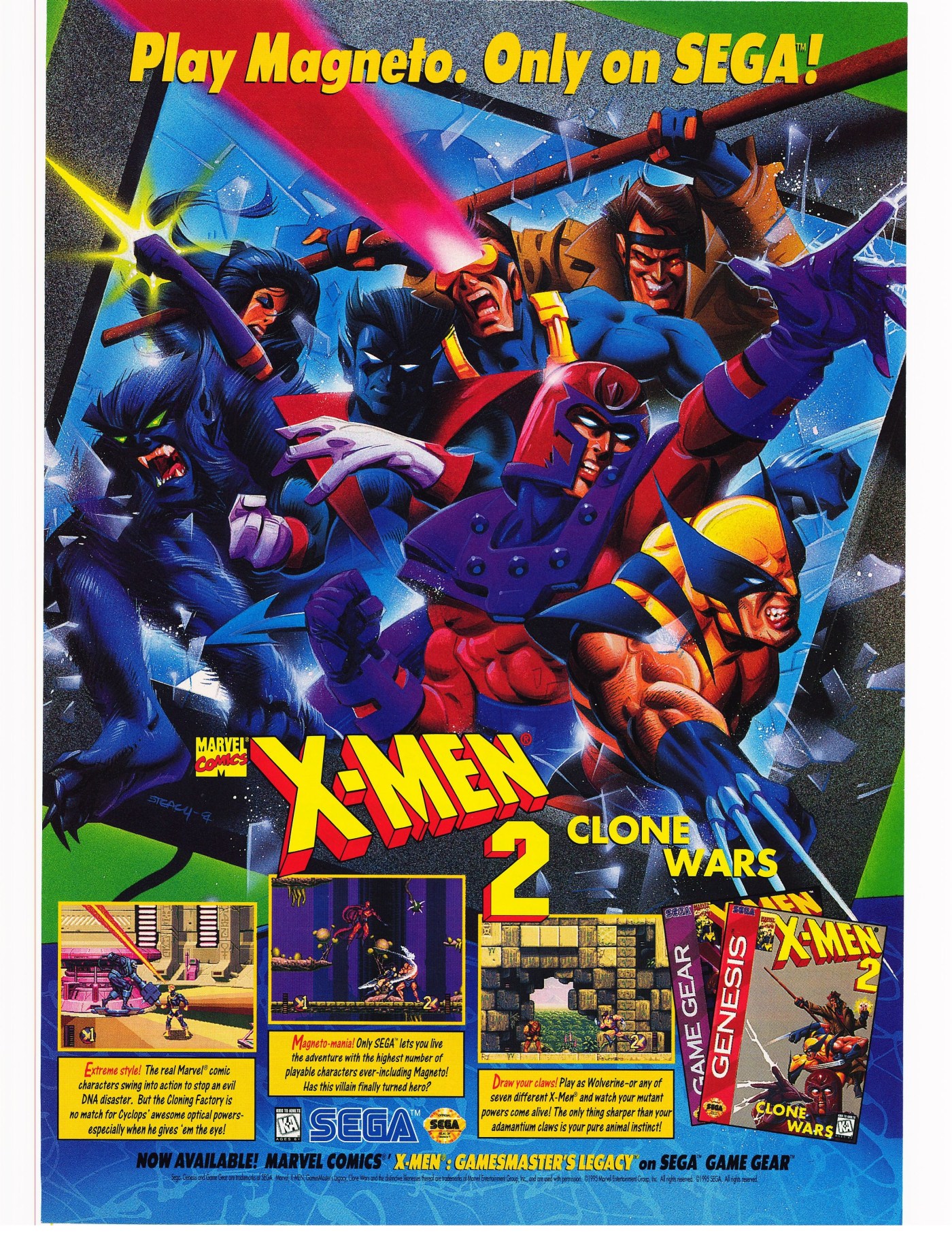 X-Men 2: Clone Wars is the title of a video game released in 1995 by Sega of America. The game is a sequel to its 1993 side-scrolling video game titled X-Men. The game was given a KA (Kids to Adults) rating by the Entertainment Software Ratings Board. It garnered some attention when it introduced the X-Men enemy Magneto as a playable character.