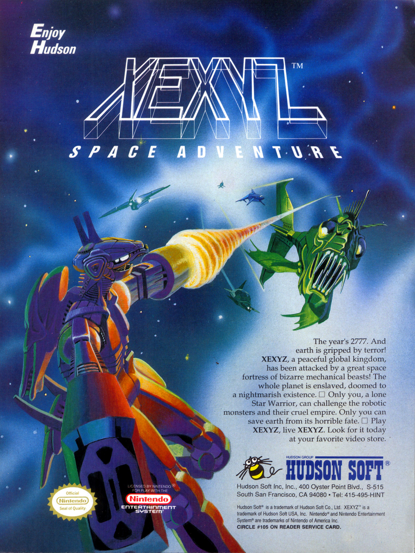 The year's 2777. And earth is gripped by terror! XEXYZ, a peaceful global kingdom, has been attacked by a great space fortress of bizarre mechanical beasts! The whole planet is enslaved, doomed to a nightmarish existence. Only you, a lone Star Warrior, can challenge the robotic monsters and their cruel empire. Only you can save earth from its horrible fate. Play XEXYZ, live XEXYZ. Look for it today at your favorite video store.