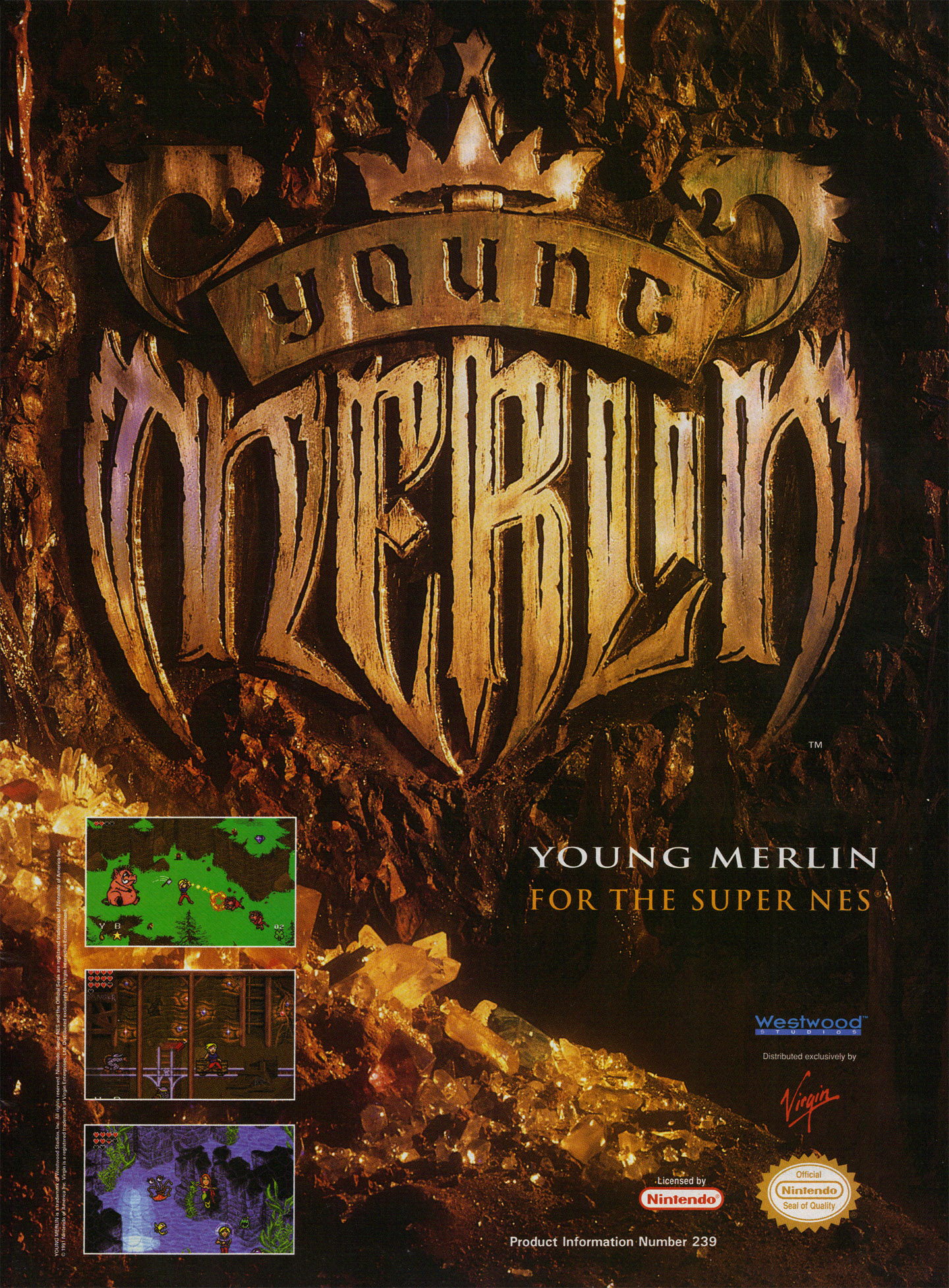 Young Merlin is a video game for the Super Nintendo released in 1994. It was developed by Westwood Studios, and Frank Klepacki composed its score. The game follows a young Merlin as he enlists the help of the Lady of the Lake to help him defeat the evil Shadow King.