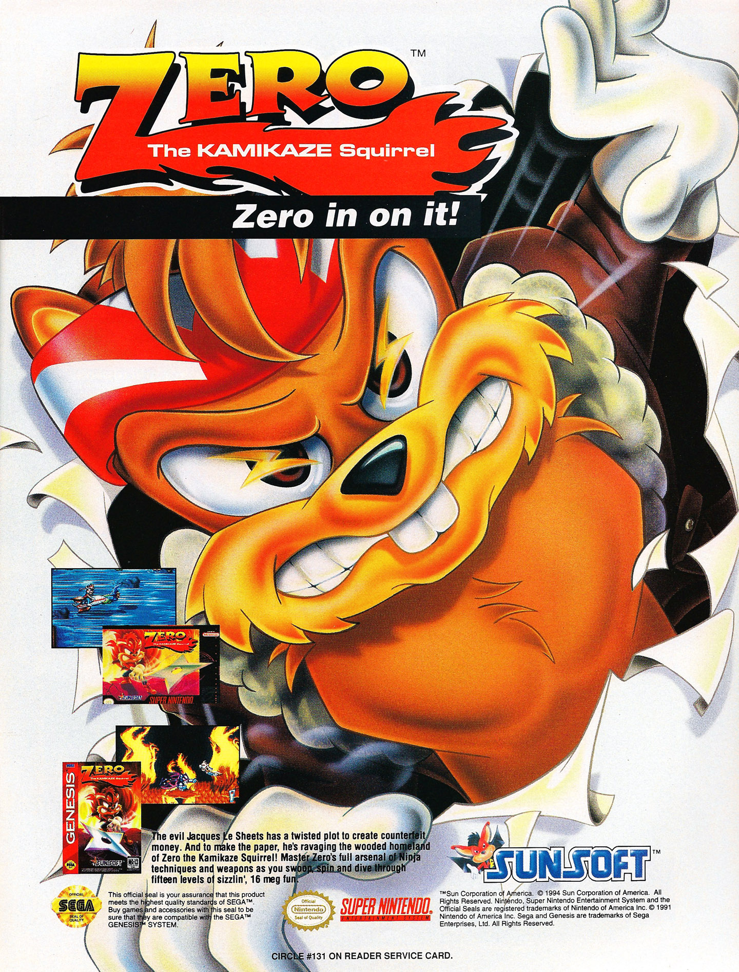 Zero the Kamikaze Squirrel is a spin-off of the Aero the Acro-Bat series for the Super Nintendo Entertainment System and Sega Megadrive.