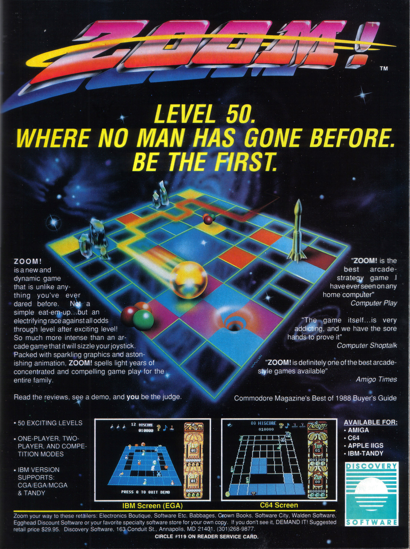 Like Discovery Software's other recent releases, Zoom is inspired by the classic coin-ops. In this case, the play mechanic is partially derived from Amidar. The big difference in the play mechanic is that Zoom lets the player's on-screen surrogate roam freely around the playfield instead of limiting it to the corridor's of a simple maze.