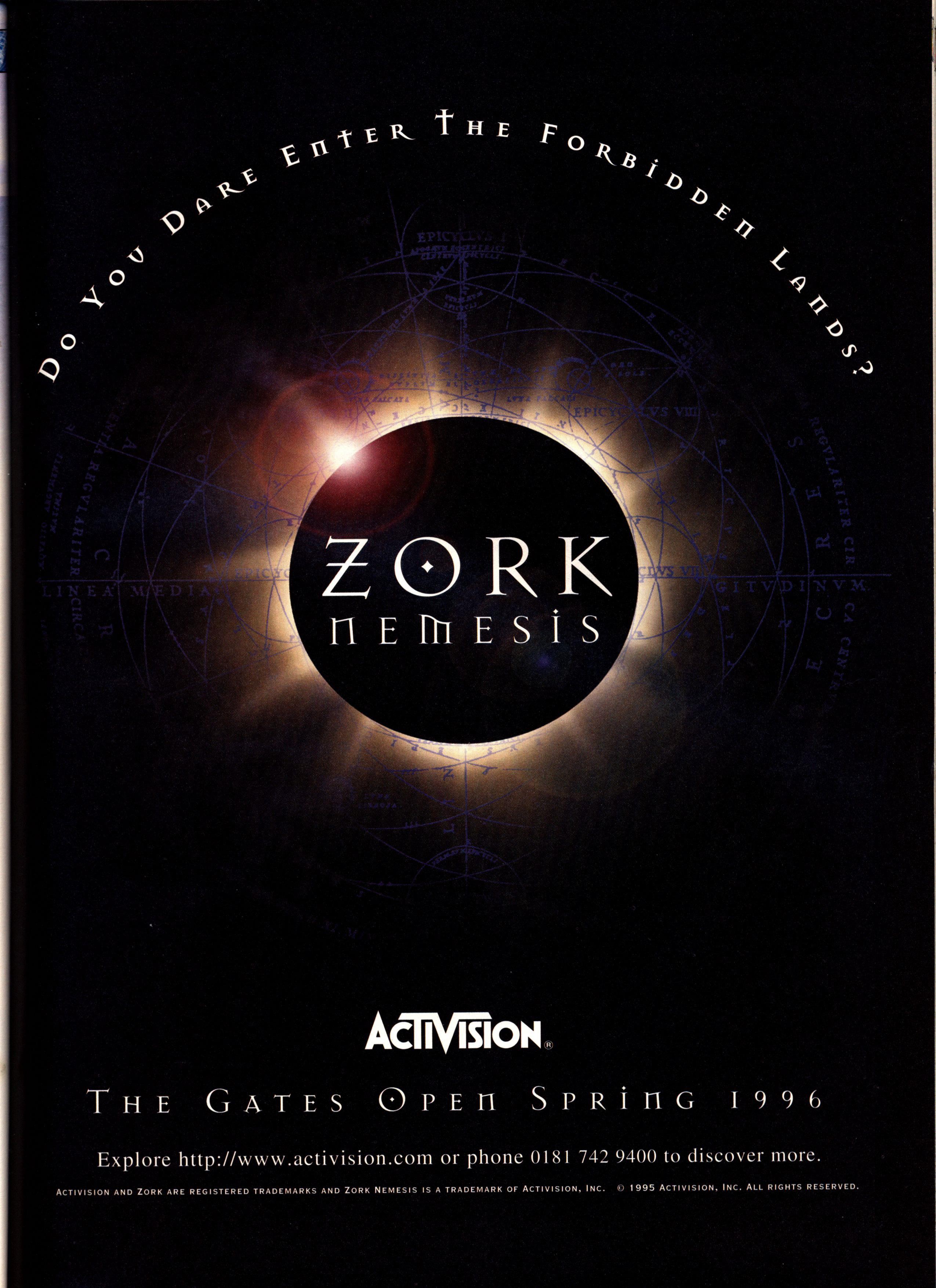 Just as Infocom took the lead in text adventure games a decade and a half ago with the original Zork trilogy, Activision has continued the line of excellence with their latest twist in the Zork saga, Zork Nemesis. They have put together a game that strives for so much and succeeds. Graphics, plot, video sequences, acting and gameplay'all are above average and combine to put together one awesome graphic adventure game. I spent many long evenings engrossed in this game and found myself more than once a little disturbed with the shadowy world that they put together. If a game can truly achieve this type of reaction, then it is worth checking out. Activision scores a 95 with its outstanding latest release in the Zork series.